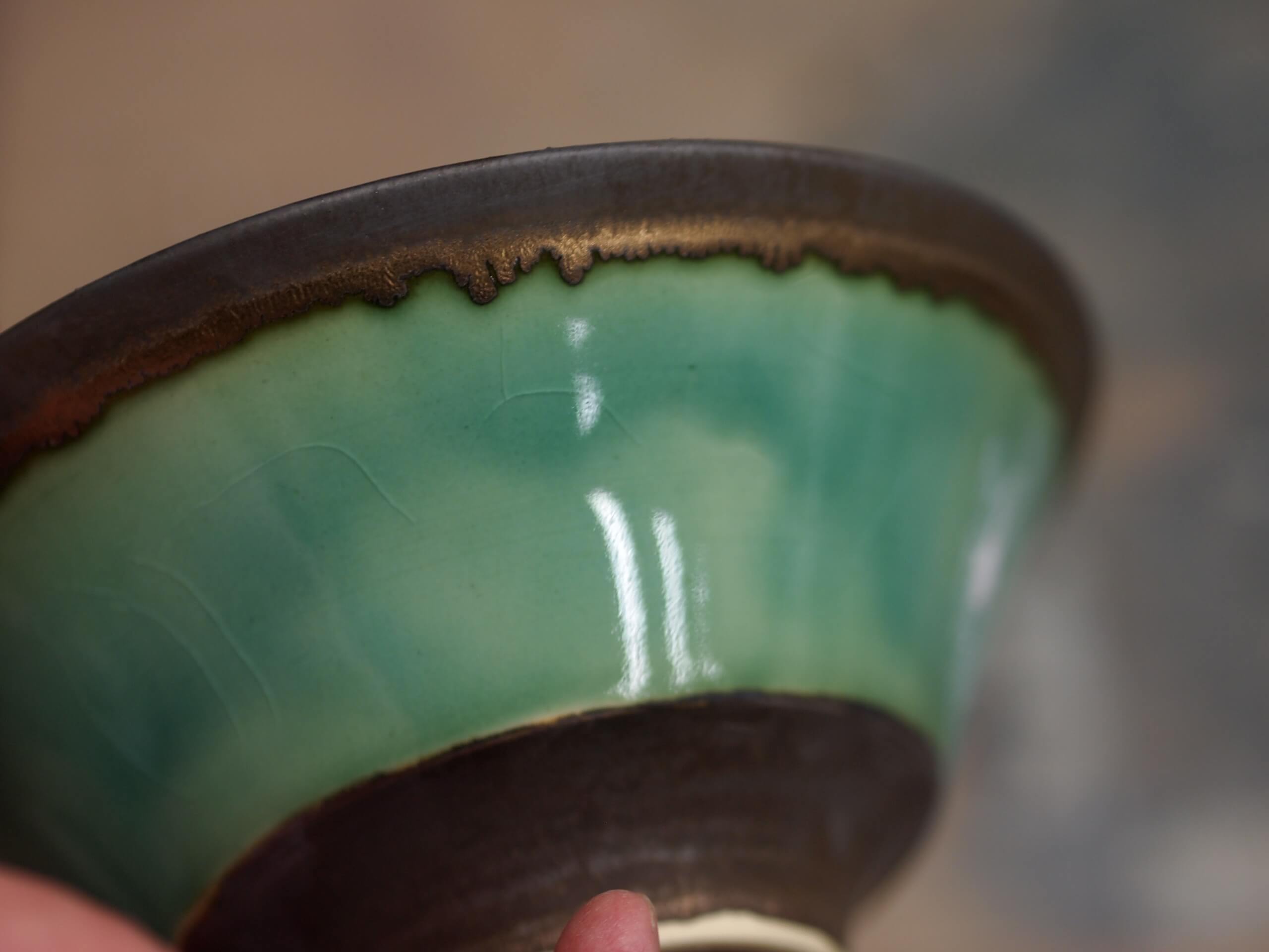 ロクロで成型して、釉薬は織部です。なかなか発色しにくい織部釉ですが、綺麗に発色してます。